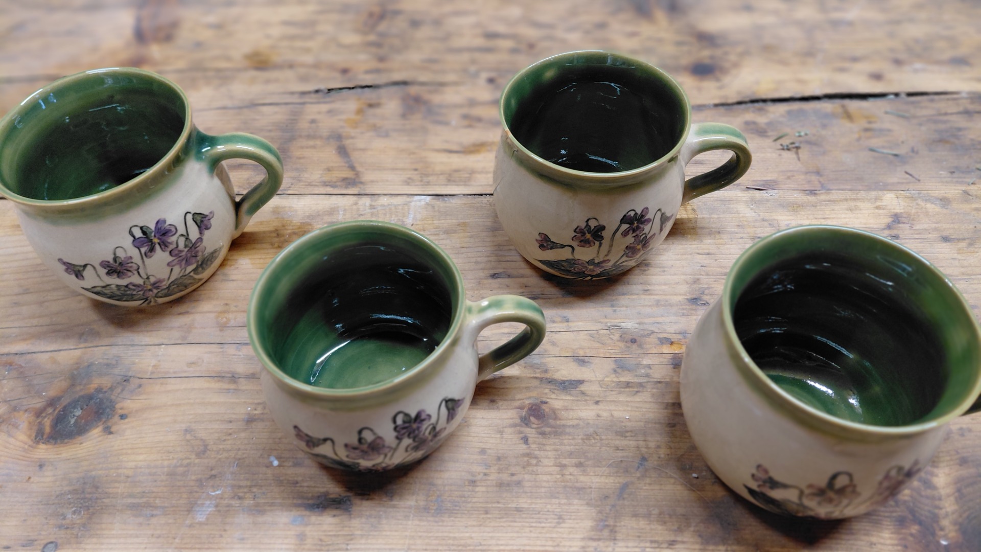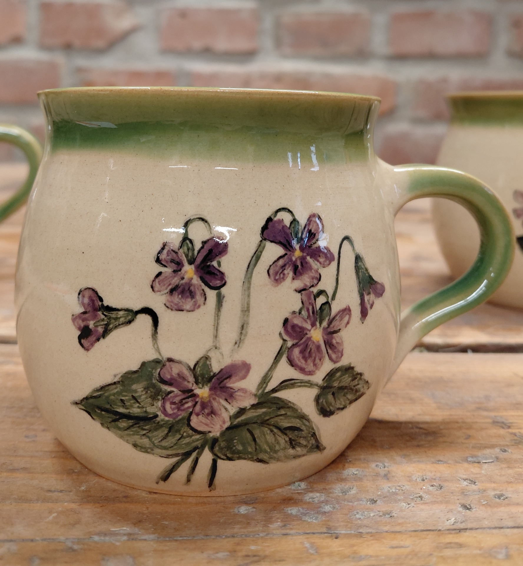 Hrníček je ručně malovaný vzorem fialky. Obsah 300 až 350ml a je vyroben z jemné kameniny. . Lze mýt v myčce na nádobí a ohřívat nápoje v mikrovlnné troubě.