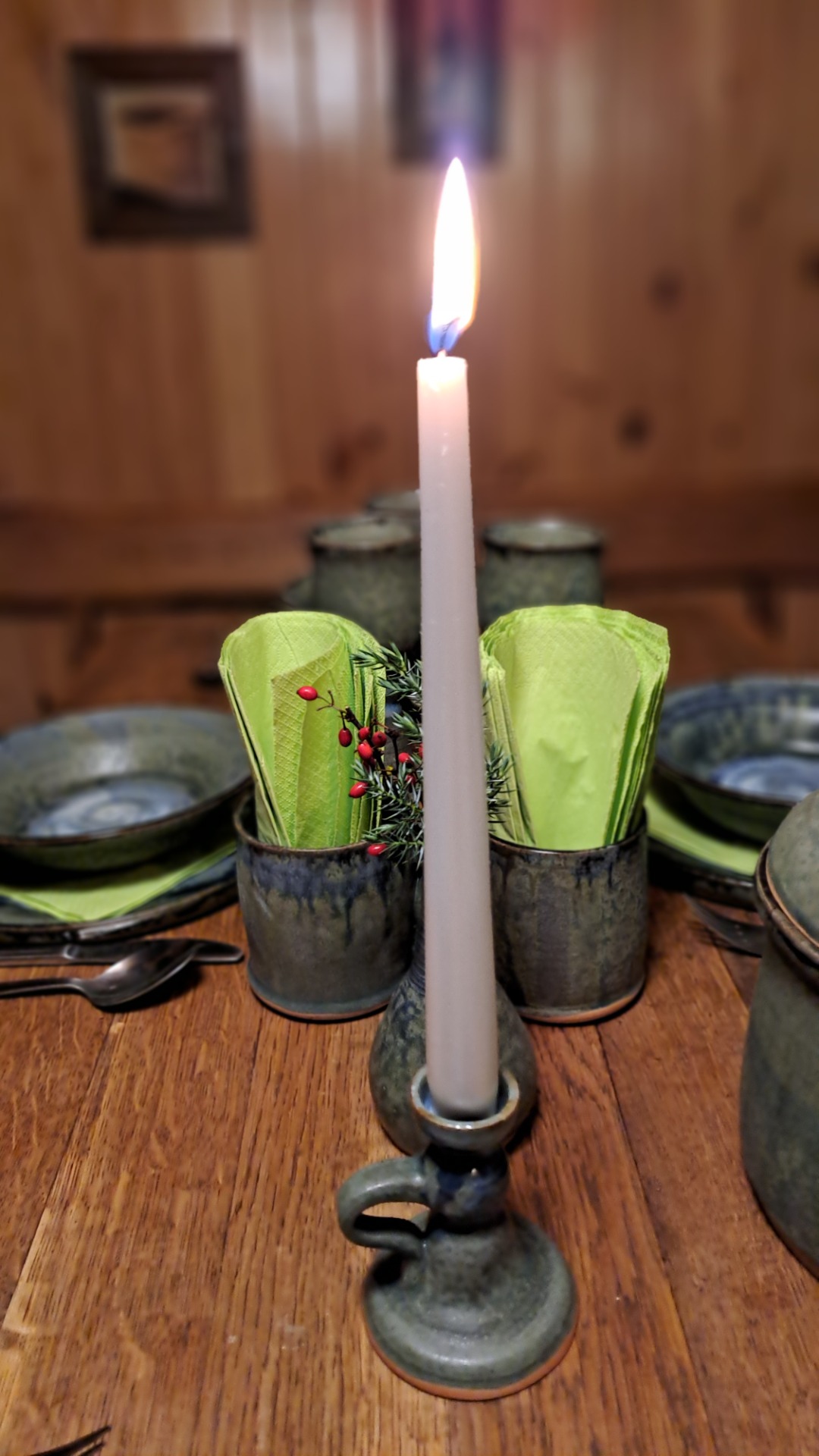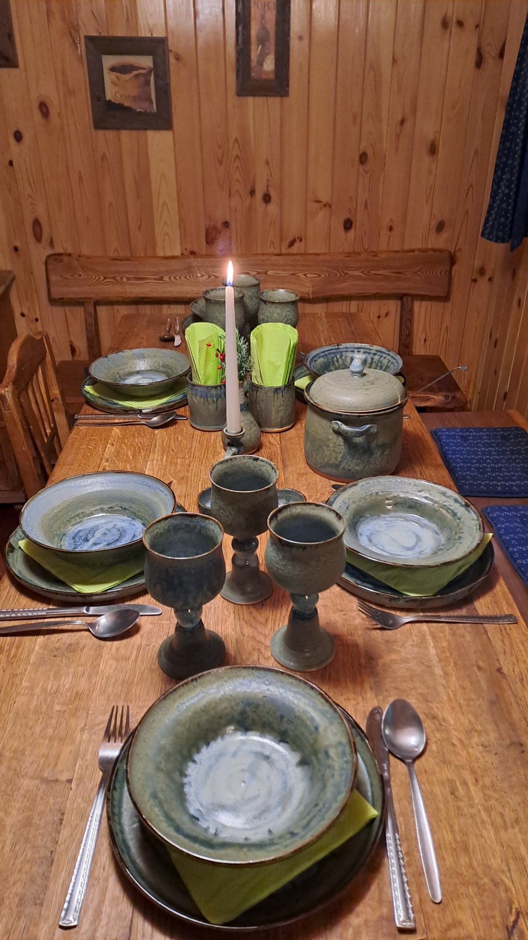Jídelní souprava je ručně vyrobená, točená na hrnčířském kruhu. Co kus to originál! Sada obsahuje 6 velkých plochých talířů, 6 hlubokých talířů, 6 kalichů, 1 stojan na příbory a ubrousky, 1 vázička, 1 svícen, 1 solnička a hrnec na polívku.