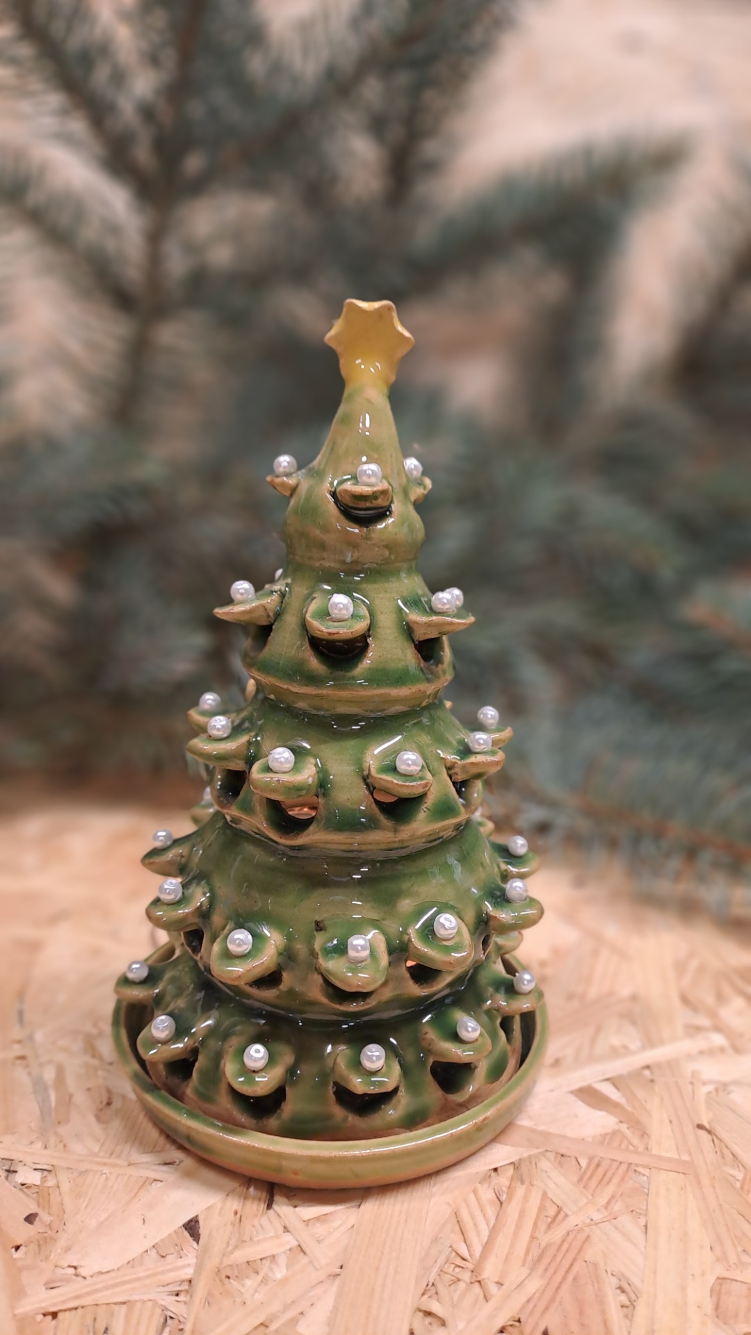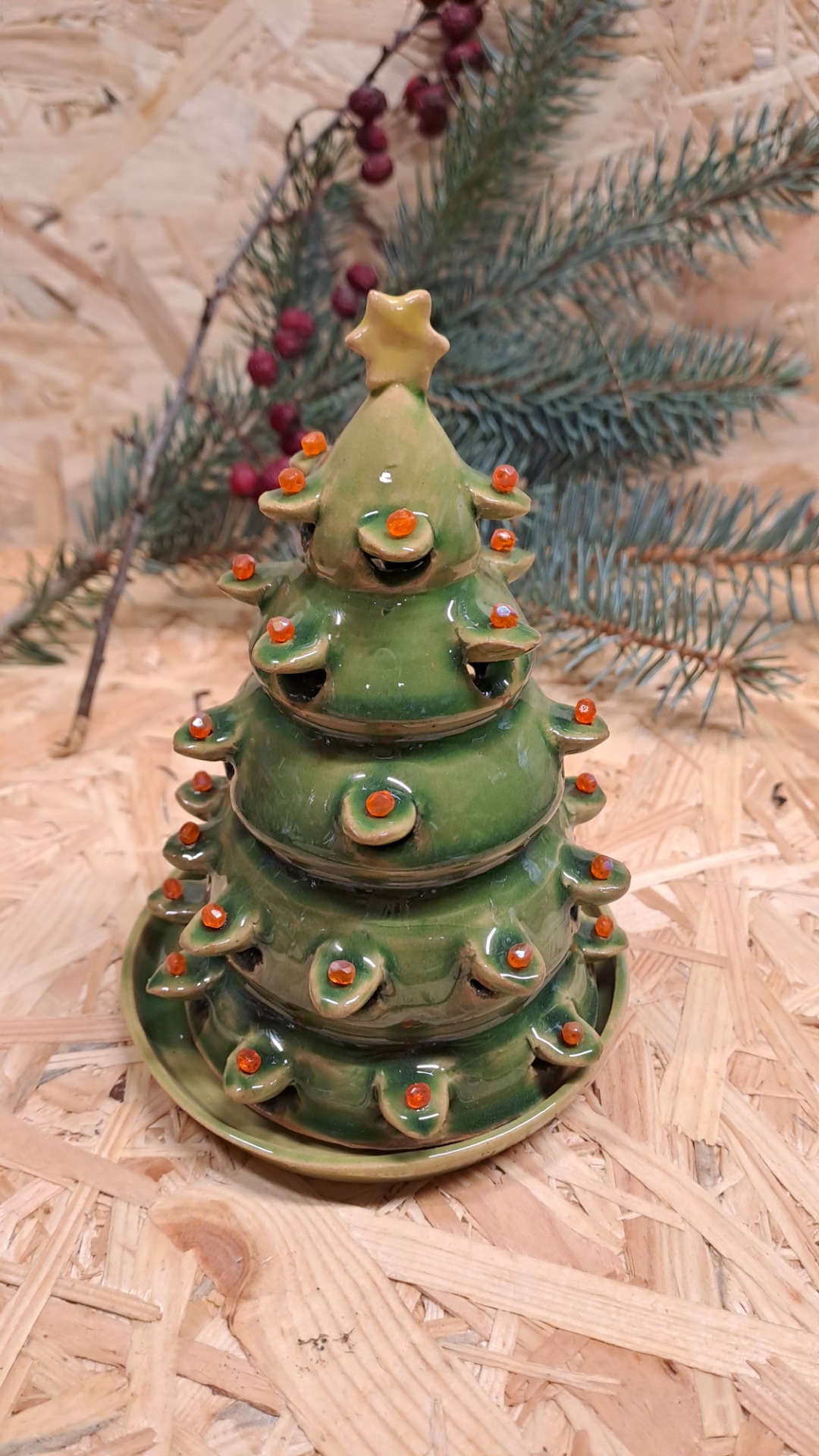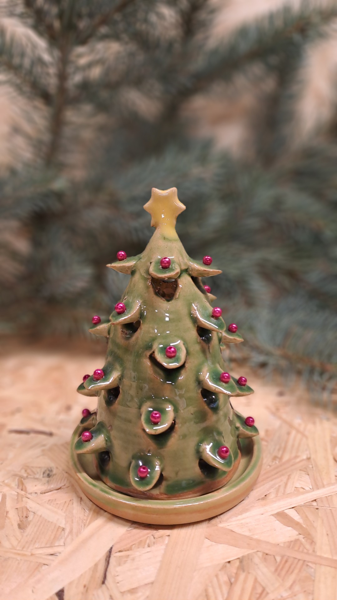 ručně točený na hrnčířském kruhu vánoční stromeček, zdobený korálky. Stromeček stojí na talířku :) jeho výška je 10 - 15 cm.